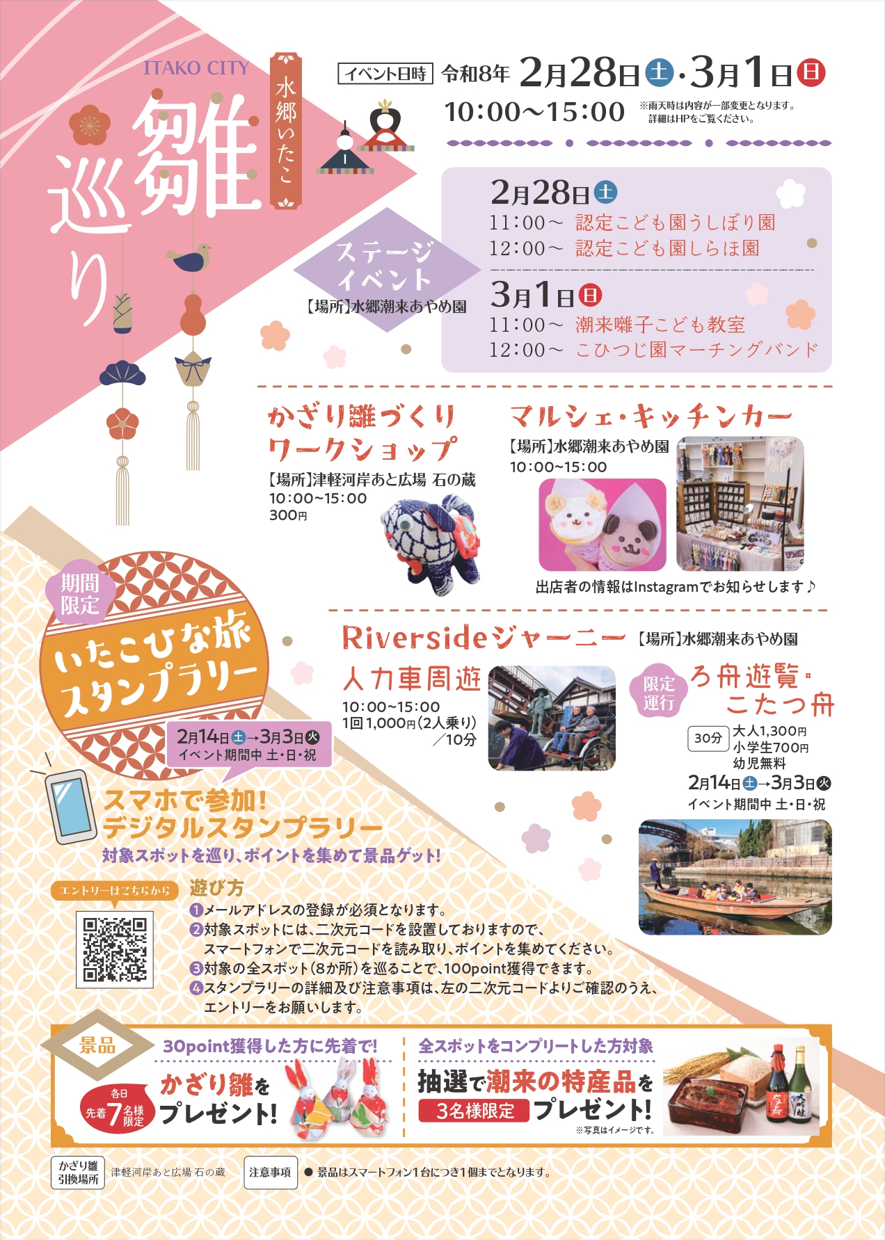また、イベントとして、かざり雛のワークショップやマルシェ、ステージイベント、ろ舟・人力車の運行など、様々なイベントを予定しております。