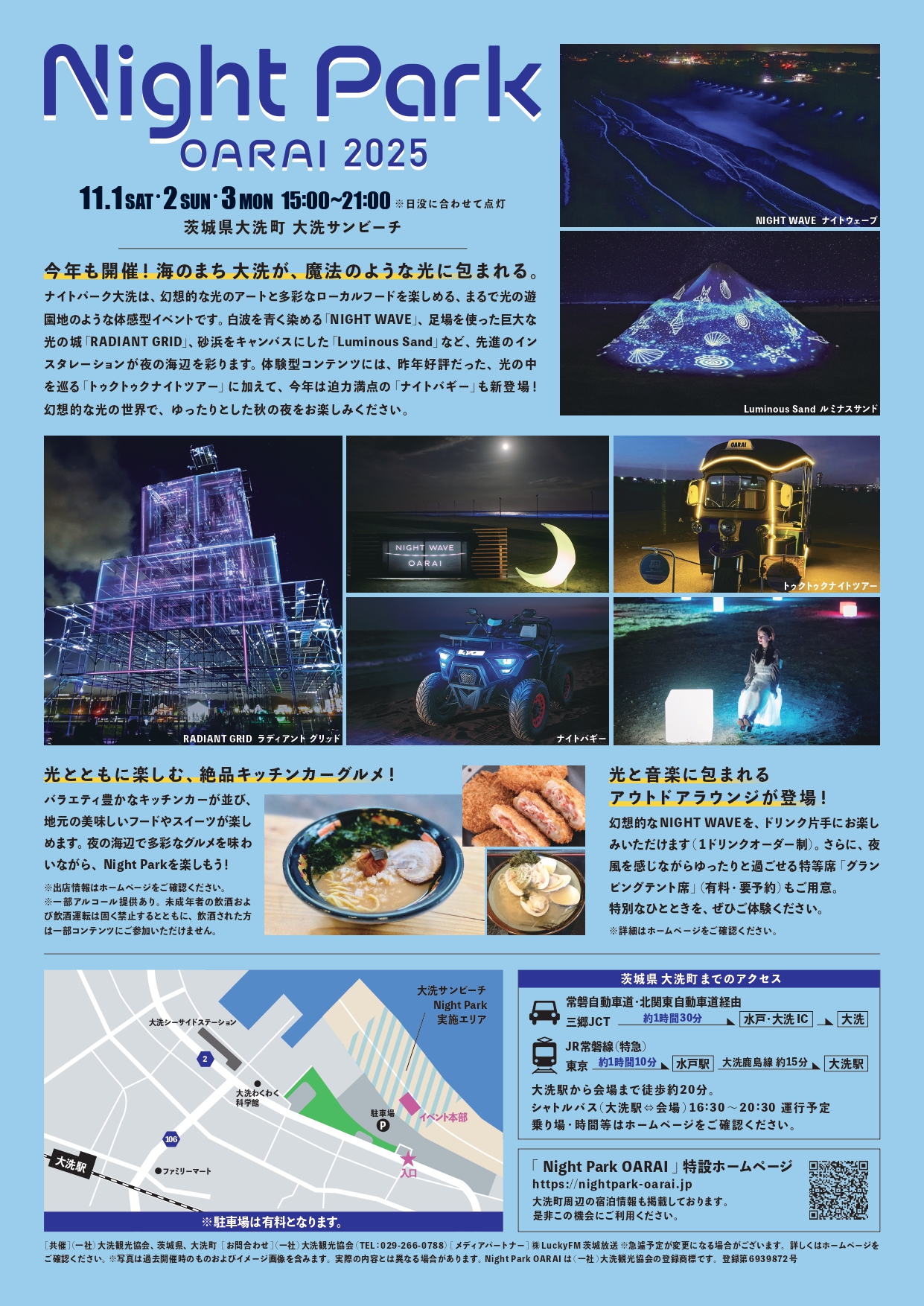ナイトパーク大洗は、幻想的な光のアートと多彩なローカルフードを楽しめる、まるで光の遊園地のような体感型イベントです。