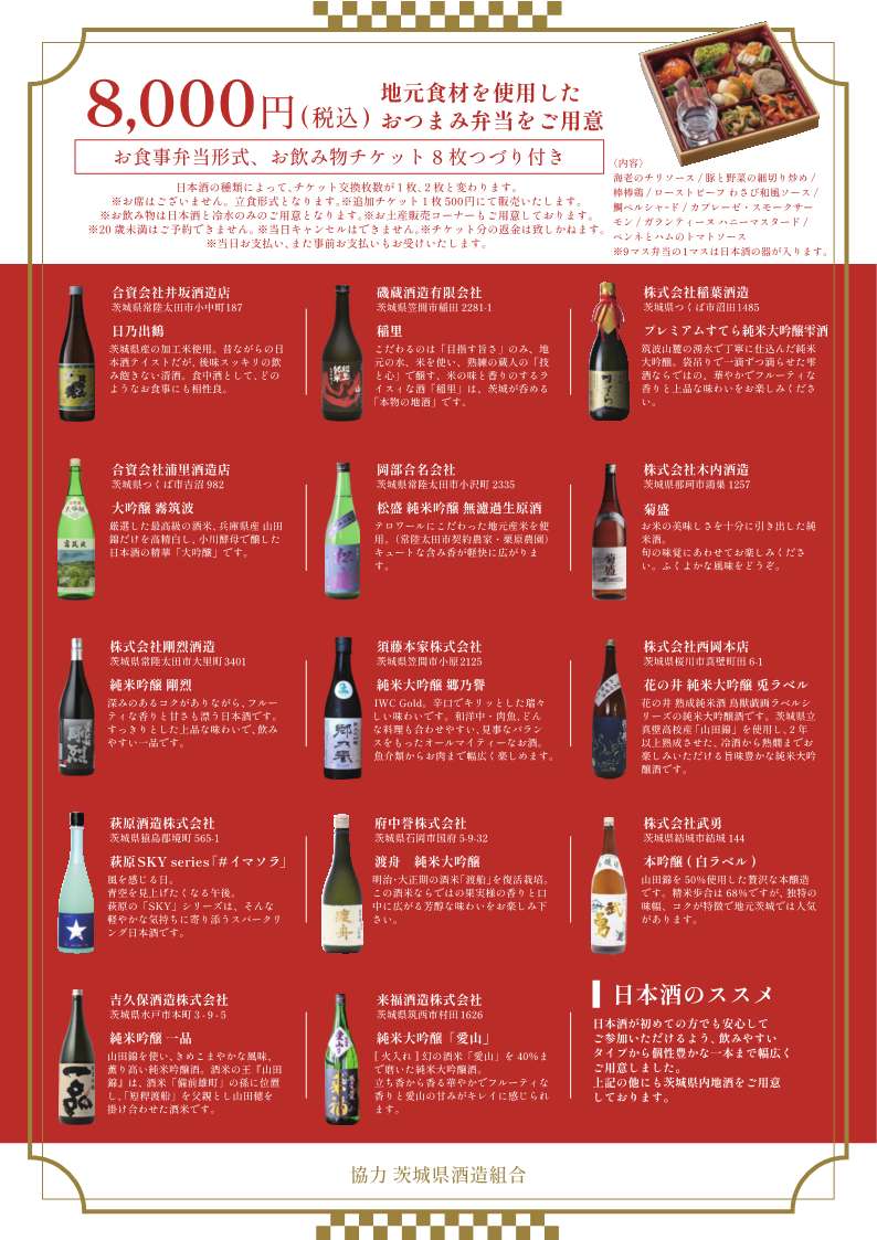 参加費8,000円にはお飲み物チケット8枚と、茨城の旬の食材を詰め込んだ特製の「おつまみ弁当」が含まれており、自分好みのペアリングを楽しみながら飲み比べができます。