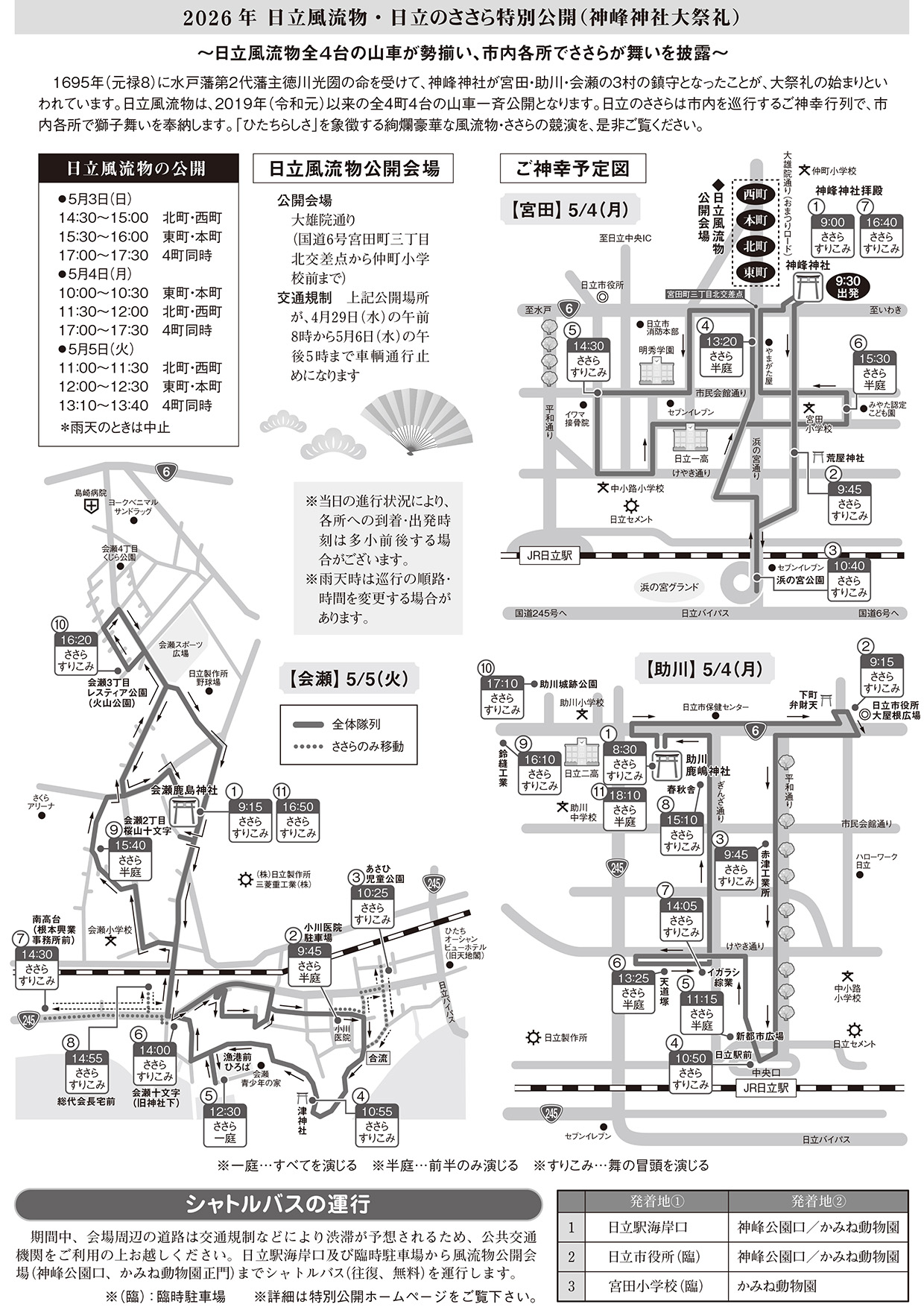 先頭から、ささら(獅子舞)、輿、神職などが大行列を作って巡行(渡御)し、さらに、ユネスコ無形文化遺産に登録されている日立風流物が4台一斉に披露されます。