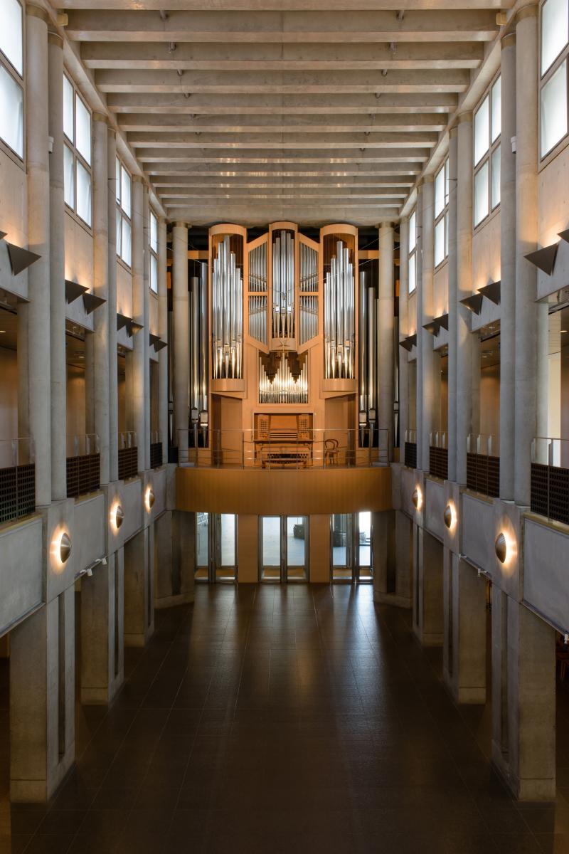 エントランスホールは吹抜けの空間で、天井が高く(幅7メートル、奥行22メートル、高さ11メートル)、残響時間の長いこの空間には国産最大級のパイプオルガンが設置されています。(パイプオルガンは、パイプ総数3,283本)