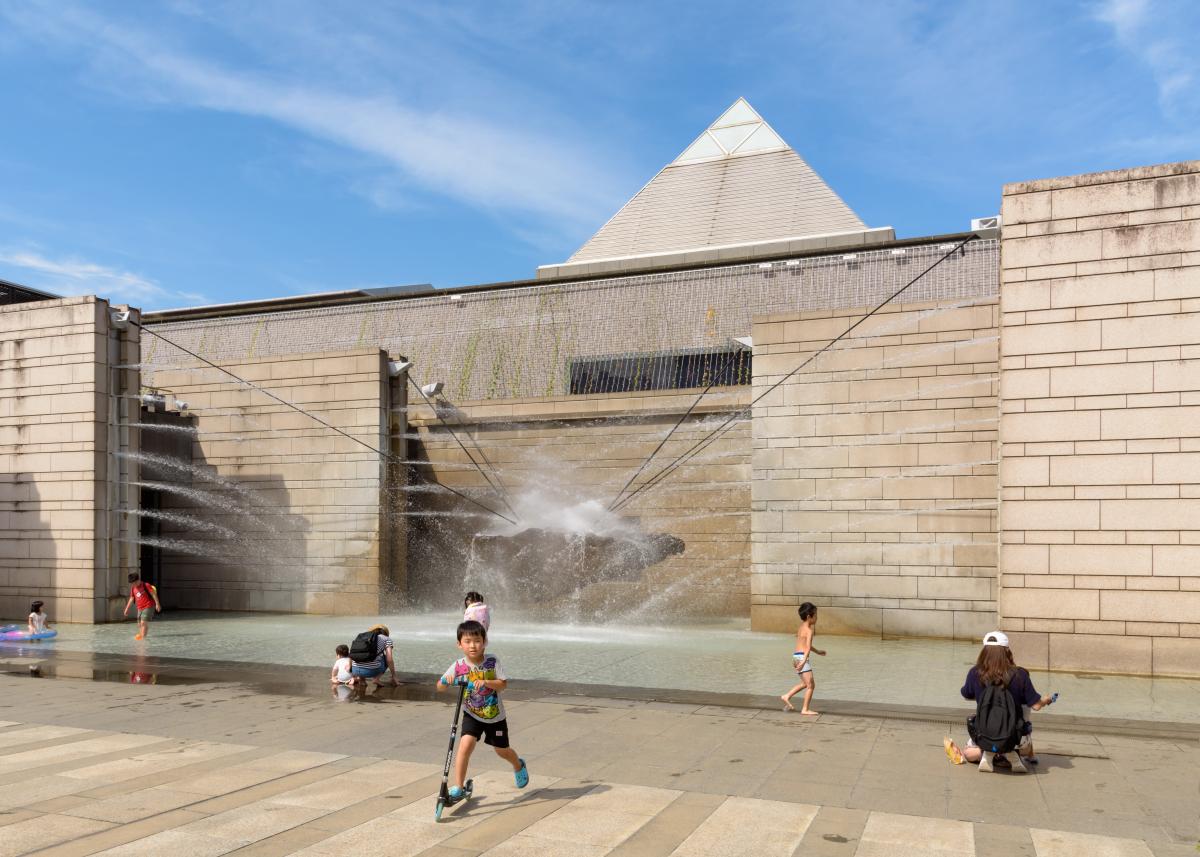 水戸市の街の中心にある水戸芸術館。ケヤキやカスケード、回廊に囲まれた芝生張りの広場を囲むように、タワーとエントランスホール・劇場・コンサートホール・現代美術ギャラリーが配置されています。音楽、演劇、美術の発信地となっている水戸芸術館は、磯崎新氏の設計。シンボルのアートタワーは水戸市制100周年(1989年)を記念して建てられた高さ100メートルの塔で、地上から86.4メートルの部分が展望室になっています。