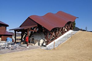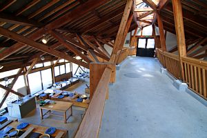 陶芸体験の出来るふれあい工房を上から眺められる2階部分は、梁の組み方が印象的です。通路だけの利用であれば、別な施設の雰囲気にもなります。