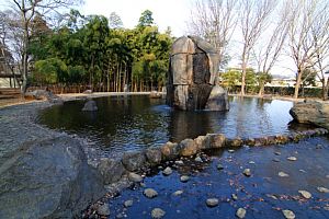 湧く池は巨大な岩から水が湧き出て、150mのせせらぎ、3段の滝を経て、芝生広場の川へ注がれている設備です。夏には子供たちが水辺で遊ぶことができます。パーク内のシンボル的存在です。