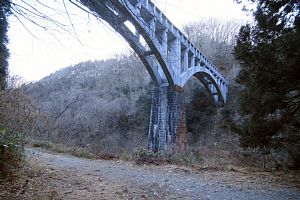 国の登録有形文化財です。大正7年に建造されました。スパンドル部に位置する直材に、わが国の橋梁分野におけるコンクリート導入初期の造形がうかがえます。花貫川の水力を利用する発電所のための取水口を設け、山中を掘りぬいて作られた導水路です。鉄筋コンクリート造2連アーチ橋で、橋長77m、幅員2m、高さ22m。夏場は緑深い木々に覆われます。 所在地 高萩市秋山字坂木 交通アクセス 支援実績 カテゴリ 古い建物 自然風景 交通 ~に見える場所 大きな地図を表示 一覧に戻る