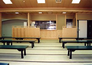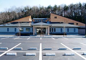 施設を正面から眺めると、左右に流れた屋根が印象的です。遠景は林に囲まれ、山間部のイメージが強いです。