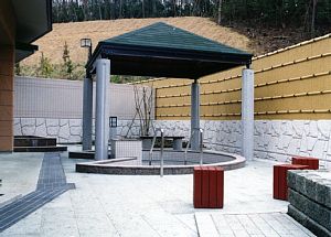 露天風呂は石造りで、竹製の塀が趣を出しています。湯船部分に東屋風の屋根が設けられているため雨の日の入浴にも対応できます。また露天風呂の遠景には林が広がり、山間部の温泉の印象にもなります。