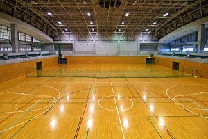 体育館の中はバスケットコートが2面、バレーボウル3面、バドミントン10面、ハンドボウル1面、卓球36台などが置けます。