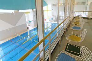 屋内プールは全長25mあり、サイドにミニプールもあります。2階のアリーナ席からも見ることができます。