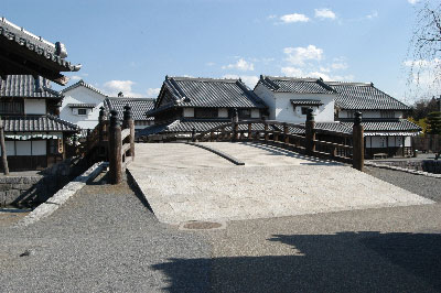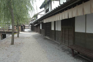 大店街は、江戸時代の代表的景観。向かい側も同じような大店が並び、大通りはまさに江戸の目抜き通り。大橋も加えた景観は、当時の日本橋界隈のようです。日本橋は、京都太秦の撮影所の橋よりも完成度が高いです。橋の上で出会うシーンや江戸の往来の撮影に使用されています。