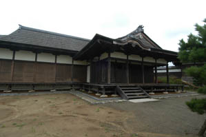 薬師門は、医者など身分の高い人物の住まいにつくられた門。武家屋敷は、室町時代から桃山時代の大名の屋敷を表現しました。当時は瓦葺きの建物はまだ少なく、武家屋敷も板葺きや桧皮葺きの屋根が主流。主殿造にあたる様式建物で、武家屋敷以外にも寺としても使用できます。妻戸・舞良戸など、様々な種類の扉がセットされているのも特徴です。武家屋敷の庭で、映画「座頭市」の御前試合のシーンを撮影しました。