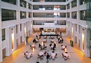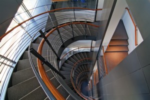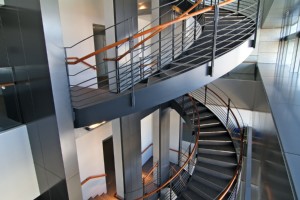 11階のアトリウムスペースから階下へおりることのできる螺旋階段は現代風のつくりで、木製手すりがアクセントになっています。アトリウムスペースはカフェラウンジになっており、25階まで吹き抜けの大空間が広がります。