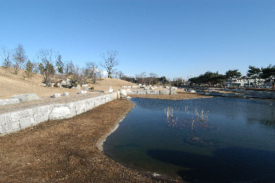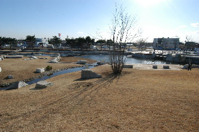 敷地の南側にあたる正面入り口には、雨水調整を兼ねた池や、緑におおわれたなだらかな斜面が広がり、水と緑の潤いのある景観をつくり出しています。春には池に、キンショウブの花が咲きます。