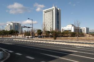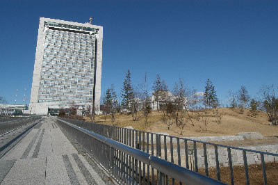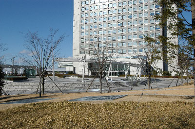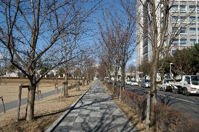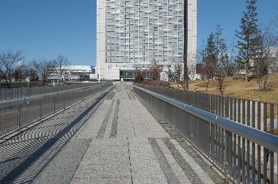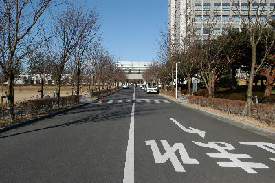 議会棟へいたる渡り廊下の階下には車道(敷地内道)が走っています。