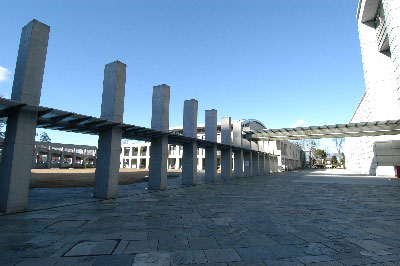 県庁舎正面入り口前の県民広場は各庁舎の正面玄関に面しており、円形の広場には近未来的雰囲気が漂っています。広場から県庁舎へと通じる歩行者専用通路は花コウ岩の歩道とシルバーのフェンスが直線で続きます。西側に位置する県警察本部庁舎と多目的広場の間の通路は、桜並木の歩道がある直線道路となっています。花コウ岩の敷石とコンクリートの柱がそびえ、モダンなイメージを感じるスペースとなっています。