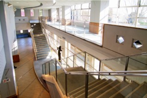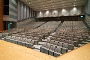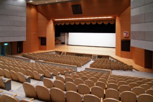 文化ホールは535席の固定席のほか車椅子席もあり、2階のホール待合空間は広く開放的です。2階から1階へ到る階段の手すりにはクリアのFIXガラスが使われ、両側からアクセスできる造り。天井のデザインは天の川を意識したものです。