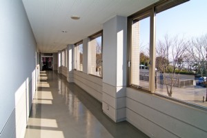 隣接する公民館・図書館へ長い渡り廊下がのび、窓からは敷地の風景、遠景には霞ヶ浦を望むことができます。病院や研究設備、サナトリウムのような雰囲気もあります。