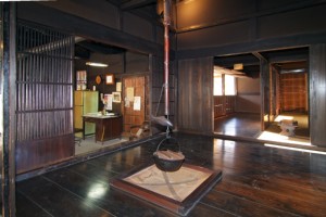 室内は広間型の間取りで、田の字型、三本溝の敷居、太くない梁など要所に特徴があります。土間と炊事場のかまどがあり、実際に使用することができます。