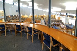 1階の書架は片流れの天井に随所にトップライトが設けられ、開放的で明るい空間です。左手下に見えるテーブルは受付カウンターです。柱を使わないデザインになっています。