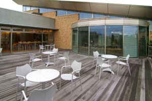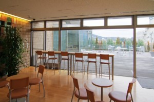 バルコニースペースはモダンな建物のデザインが全面に見える場所です。研究施設や新聞社の休憩スペースなどにも雰囲気が似ています。