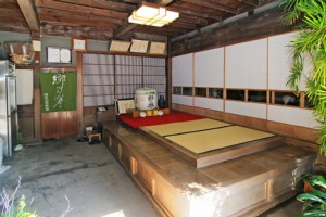 母屋入ってすぐの土間部分は、ちょうど腰掛けられる位置に台のある、畳のしかれた板の間があります。時代劇も現代劇もとることのできる個性ある空間です。
