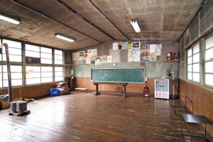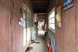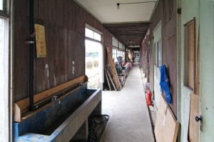 校舎北側は軒が大きく出張り、各教室に出入りできる場所に下駄箱のあるのが特徴的な造りです。使用済の消火器などが置かれています。アトリエとして使用されている部分もあります。軒下には流しの設備もあります。