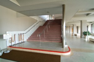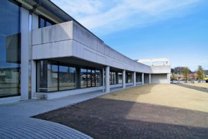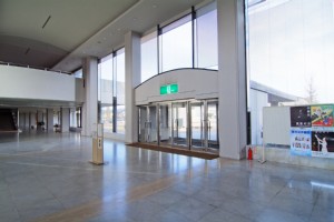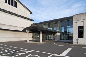 市民交流センターパルティホールの西面のエントランスは、突き出し玄関やロータリーがあり、病院施設のような印象があります。