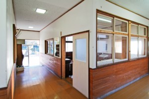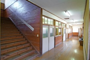 1階の廊下沿いの壁は腰壁仕様。廊下幅も大変広くゆったりしています。宿直室や流し、昇降口などの設備が整います。