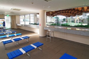 プールから水着のまま出入りできる休憩室は、ガラス張りのカウンターからは館内の様子を眺めることができます。