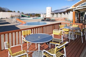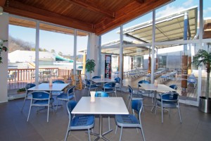 館内のカフェテラスからは、屋外プールや野球場といったスポーツ施設が見えます。