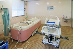 浴室は、隣りにヘルパーステーションがあり、アコーディオンカーテンで仕切られています。機械浴設備も撮影に使用可能です。
