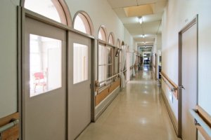 廊下は、南側に事務室、作業室、休憩室。北側に浴室、給食室、カウンセリングルームなどが並びます。