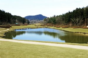 水辺の広場は、南北に長い池を遊歩道や里山が取り囲み、北側に佐白山を望めます。