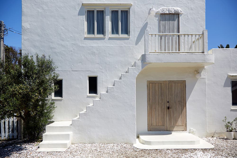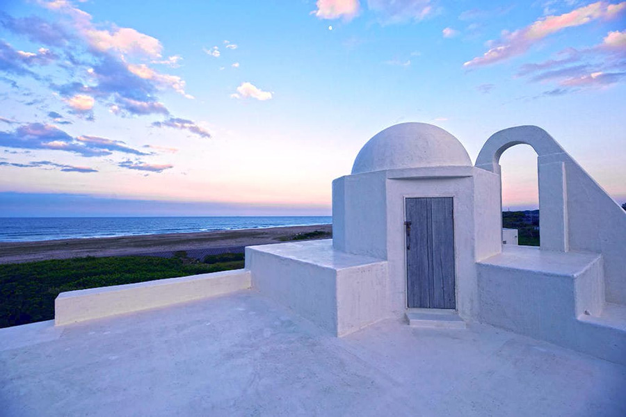 海外のリゾート地を思わせる貸しスタジオ。ギリシャのミコノス島のパラポルティアニ教会と、街なかの建物の特徴を取り入れてデザインされました。電線、民家などの影響を受けずに、海・空・グリーンぬけの撮影ができます。青い空と紺碧の海の広がる青塚海岸に建つスタジオイオスは、ドラマ・プロモーションビデオ・カタログ・写真集などさまざまな撮影の舞台となっています。