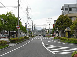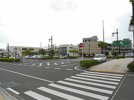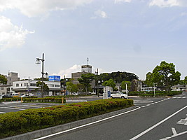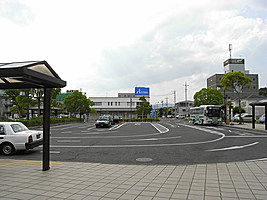 常磐線磯原駅の西口。駐輪場やロータリーなどがあり,大通りが走る。