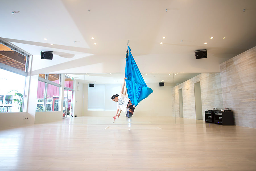 白を基調とした落ち着く雰囲気のスタジオにて、今注目を浴びているハンモックを利用した空中ヨガをお受けいただけます。(その他レッスンもございます)隣のトレーニングルームでは、マンツーマンのパーソナルトレーニングを行っております。