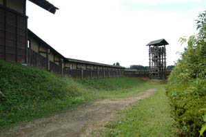 二層櫓は、戦国時代末期の時代背景を元に、外観二層の姿を復元したものです。そのほか、敵の見張りや自軍への指令拠点、石や火矢の発射台にも利用された建物を再現した井楼矢倉があります。この矢倉は米や饅頭を蒸す蒸籠と同じように井形に組んだ方形材を四本柱支柱にはめ込んで組み上げた櫓で、多くの場合は車輪が付いた移動式でした。