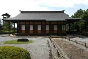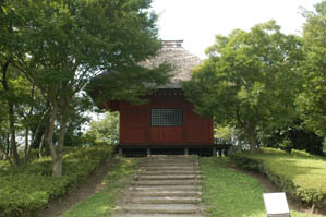 主殿は茨城県潮来市の堀之内大台城から出土した主殿遺構を参考に建築されました。入り口左右に立砂(盛砂)を置き、主殿三方は枯山水庭、主室である付書院前には花壇が設えられています。また、逆井城があった時代に建てられた観音堂は、大安寺にあったものを移築したものです。