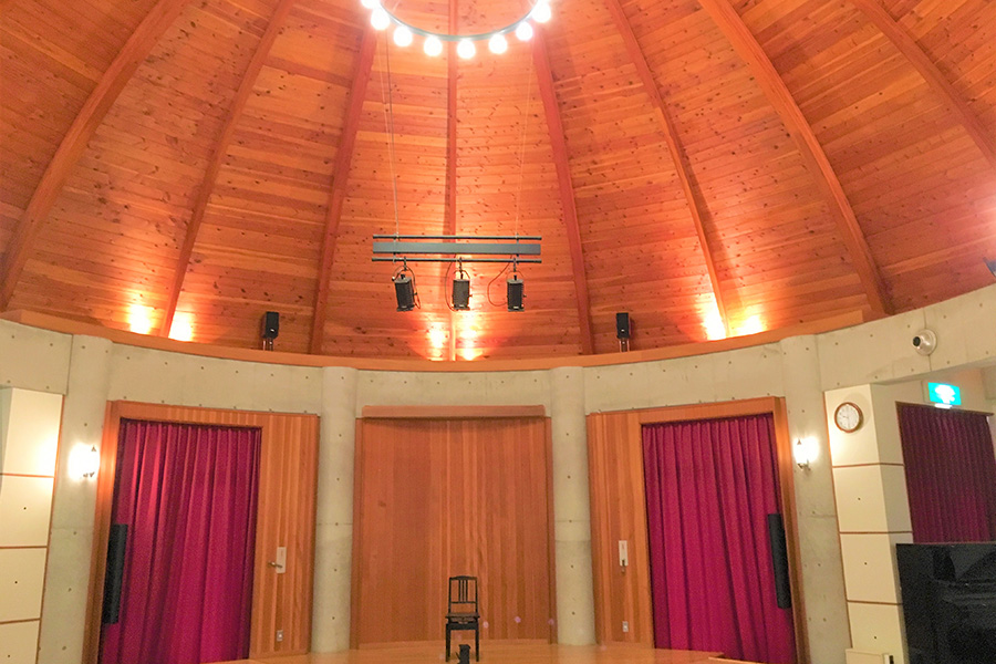 スペインの歴史的ギターコレクションと生ギターを楽しむ設計のドームホール、風光明媚な里山の丘の上。