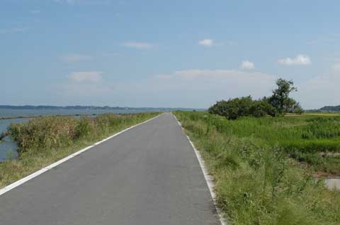 霞ヶ浦と田園地帯の真んなかを走るように湖岸の道が伸び、直線道路の先は湖にそってゆるやかなカーブを描き、周辺にはほとんど建築物がありません。