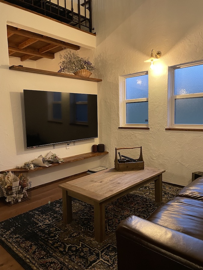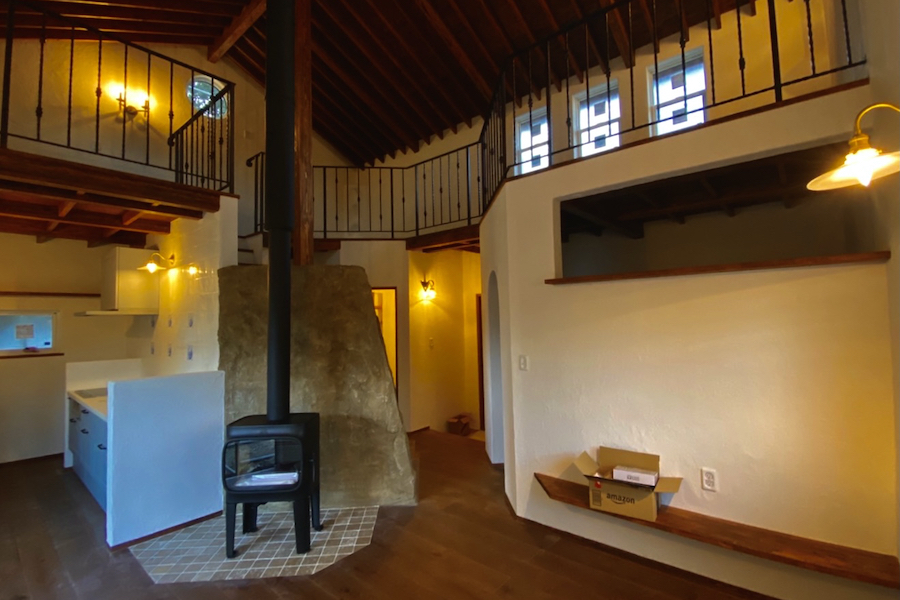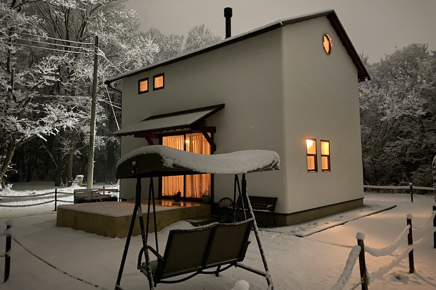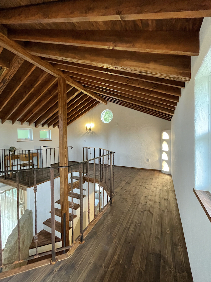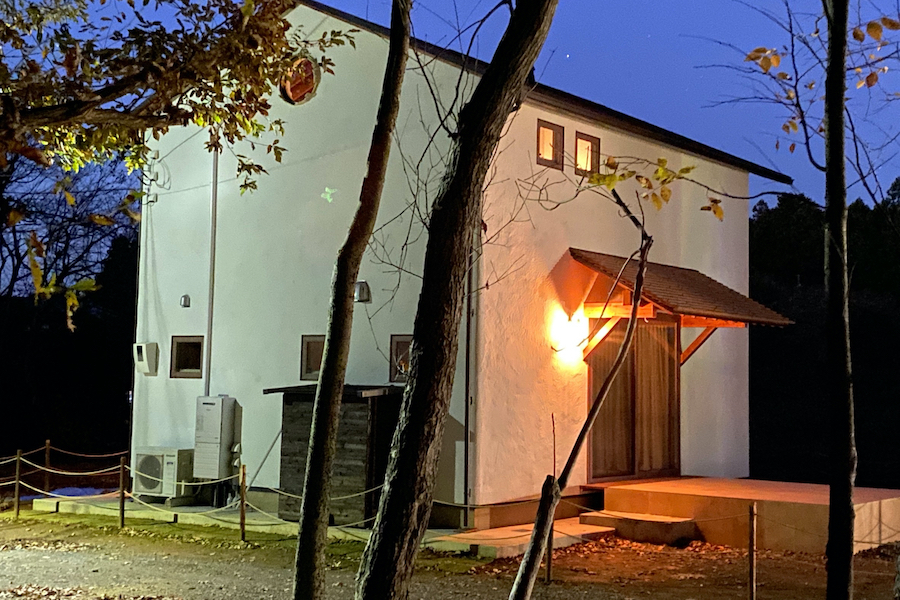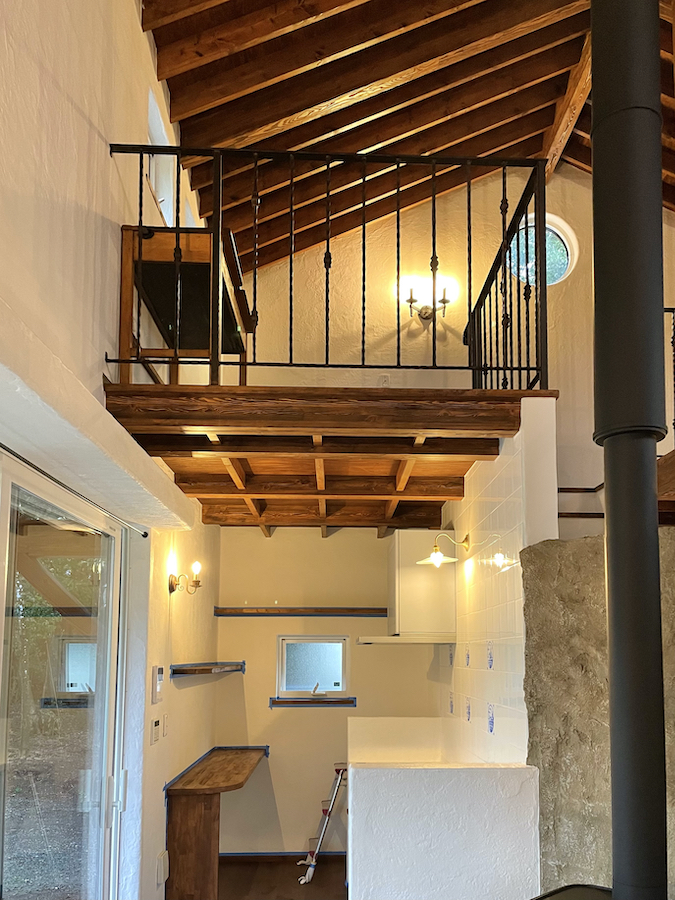 雑木林の脚に建つ南フランス調の2階建建物ラフェルム。 外壁は長年漆喰を塗り重ねたような古美を演出し内部も同様エイジングされた空間となっている。薪ストーブも設置され時間の流れを遅らせる田舎暮らしの空間。