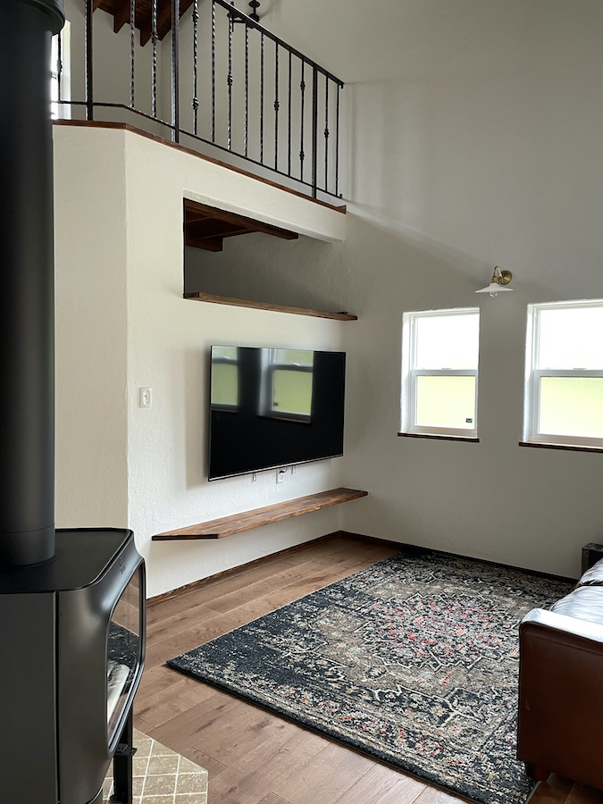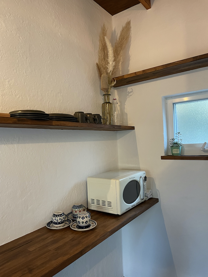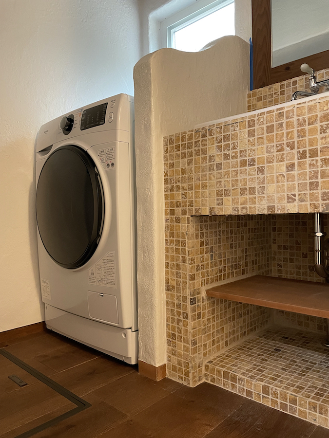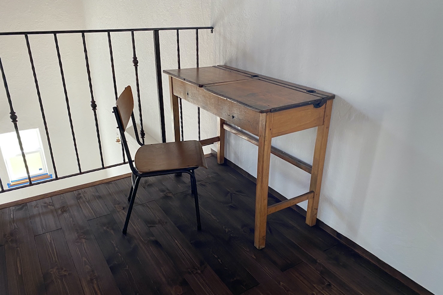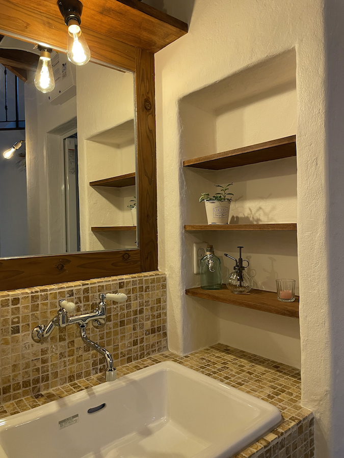 雑木林の脚に建つ南フランス調の2階建建物ラフェルム。 外壁は長年漆喰を塗り重ねたような古美を演出し内部も同様エイジングされた空間となっている。薪ストーブも設置され時間の流れを遅らせる田舎暮らしの空間。