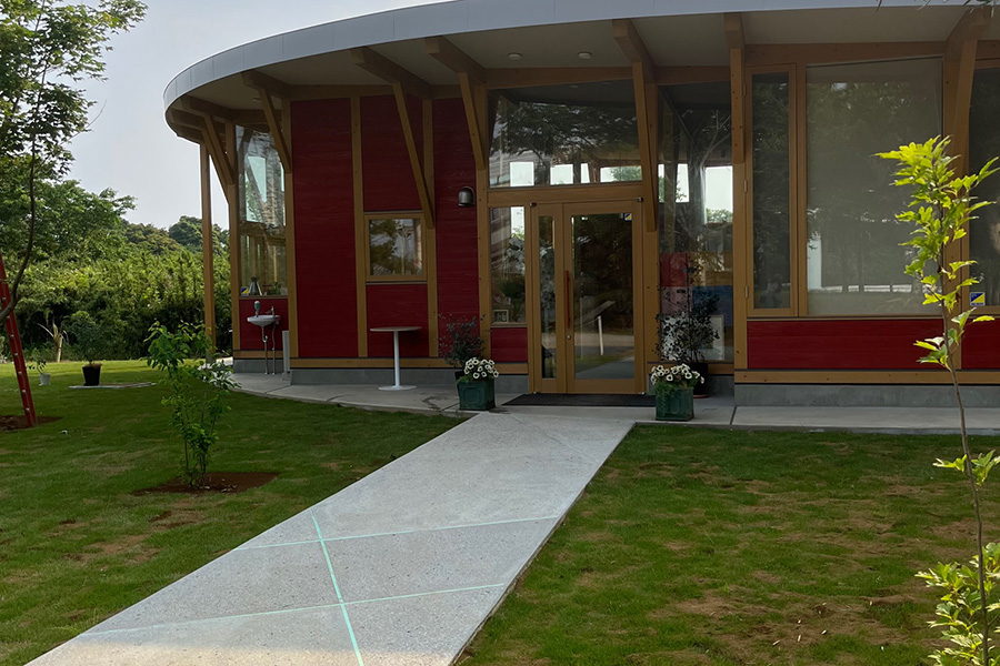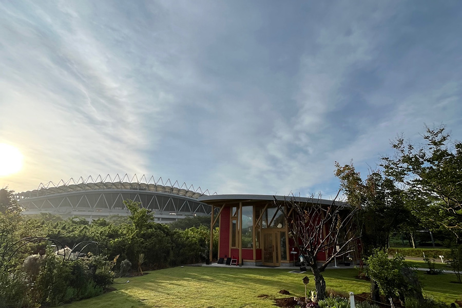 建物は木造で茨城県材を利用しており、飛行船のイメージさせる楕円形になっています。また、建物内にはカフェもあります。