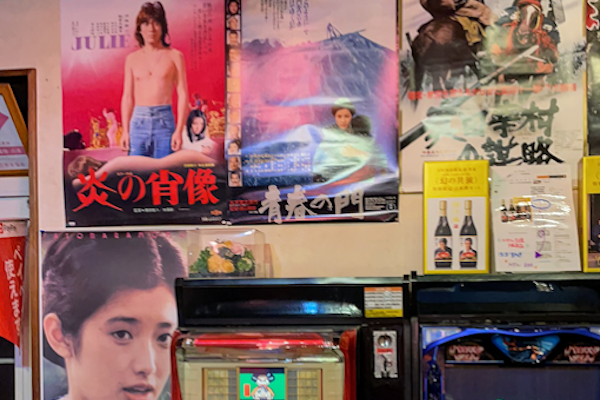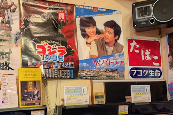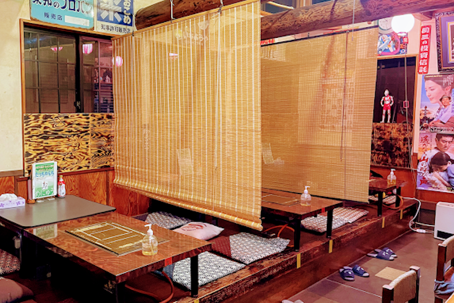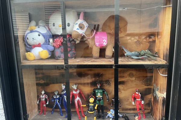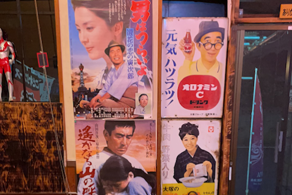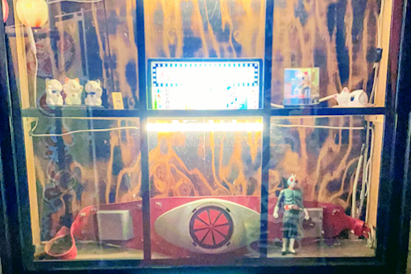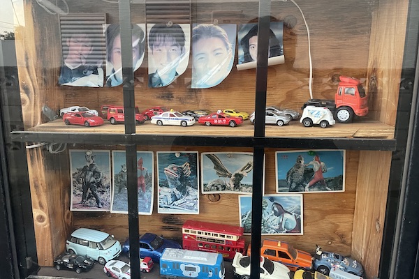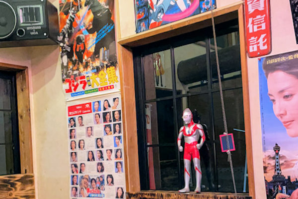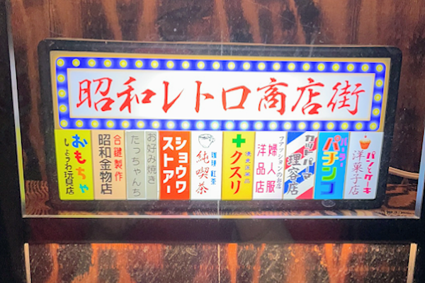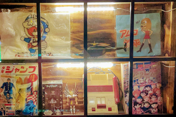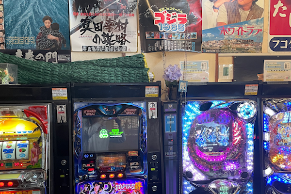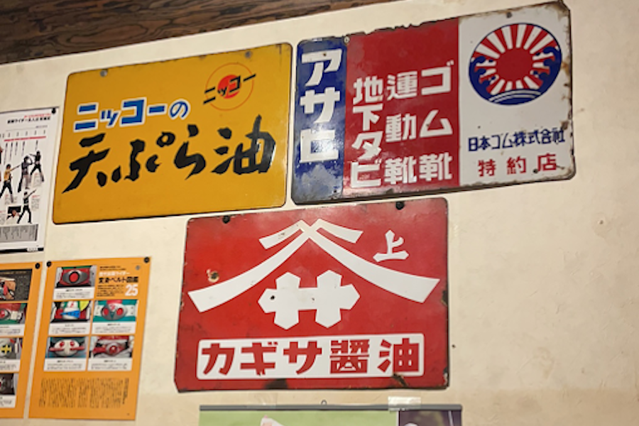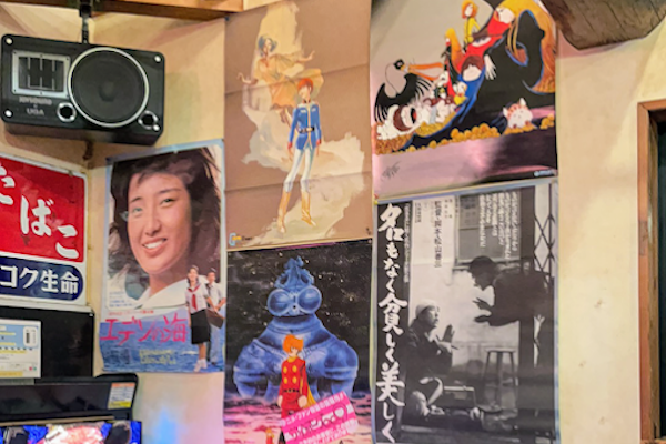 店内には、昭和風に作られた看板・ポスター・おもちゃなどが飾られているほか、ひと昔前のパチンコ台やカラオケ、ゲームも設置されています。