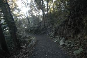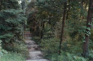 参道の石段は、木立の間をふもとまで続き、片側に電柱と電線があります。三重塔から墓地へ至る曲がりくねった林間道は未舗装で、片側は崖になっています。