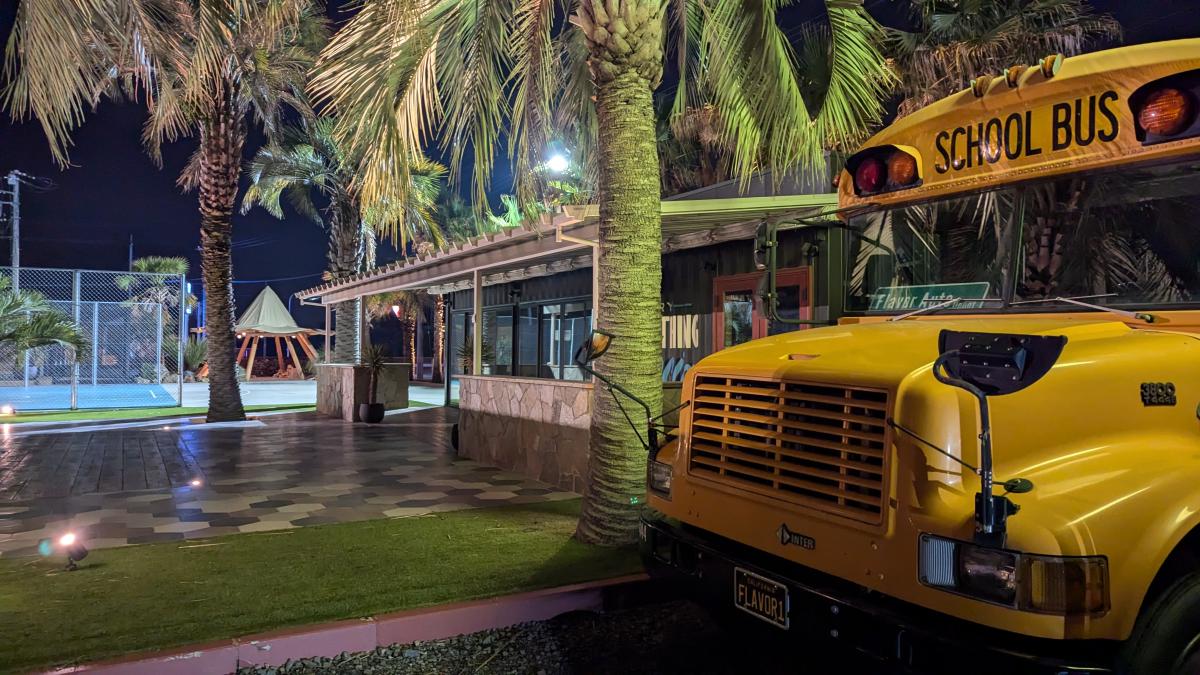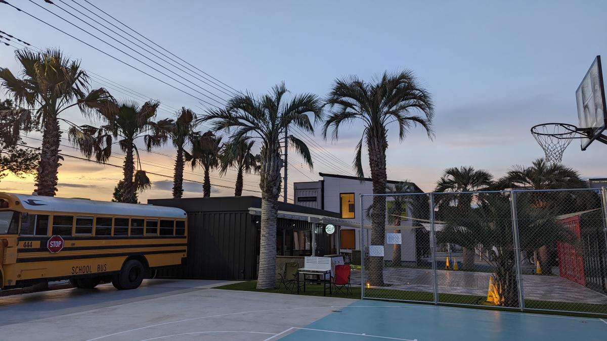 エリア内にはヤシの木、バスケットコート、外国風スクールバス、ビンテージアメ車、