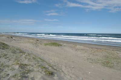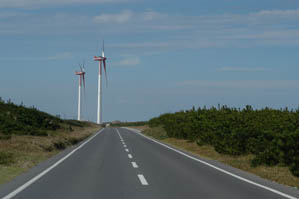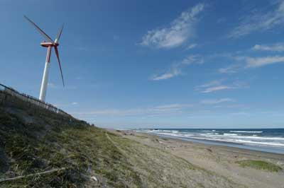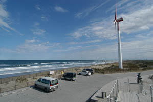 シーサイドパークの下には鹿島砂丘の砂浜と鹿島灘が広がり、海岸の左右には消波用のヘッドランドが設置されています。松林の間を通る見晴しの良い海岸道路を走ると、遠くからでも風車を望むことができます。