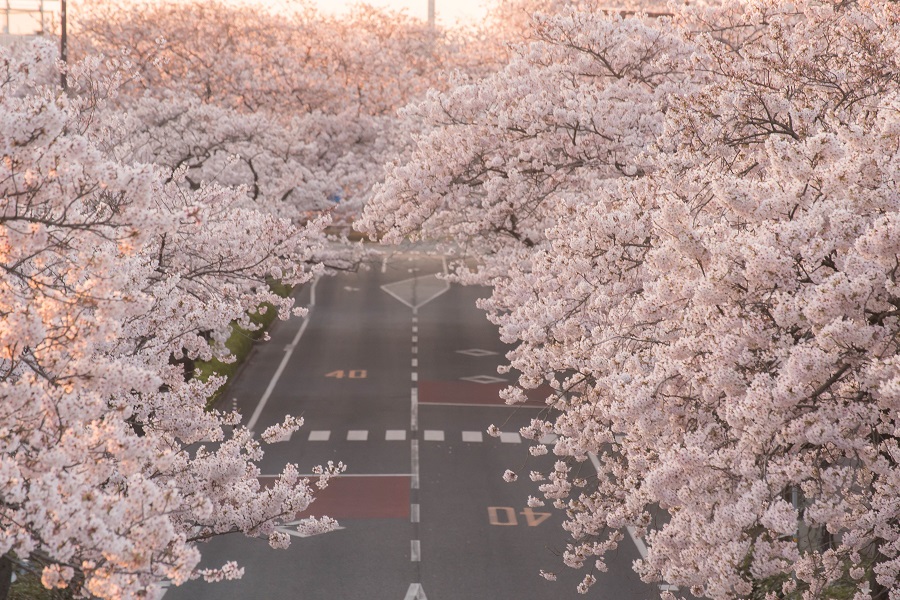 朝陽を浴びる平和通りの桜並木