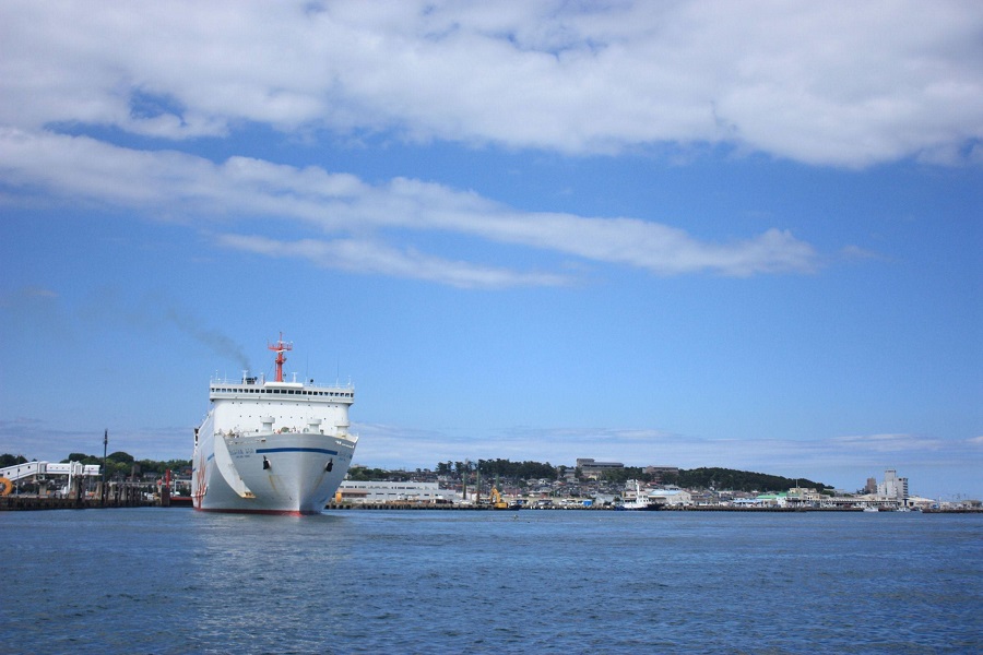 海辺から眺める大洗町とフェリー