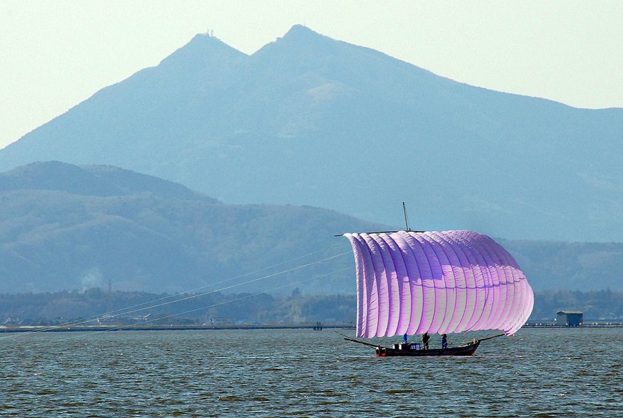 筑波山とパステルカラーの七色帆引き船 ラズベリー